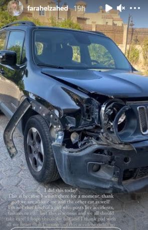 ونشرت فرح صورة لسيارتها المهشمة عبر حسابها على (انستجرام) وعلقت: (الحادثة حصلت في لحظة وبشكر ربنا إني بخير وكل اللي في العربية التانية كويسين لازم نخلي بالنا).