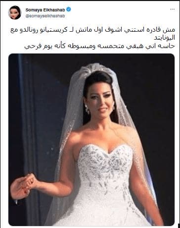 ونشرت سمية الخشاب صورة لها عبر حسابها على (تويتر)، وهي بفستان الزفاف، معقبة: (مش قادرة استنى أشوف أول ماتش لكريستيانو رونالدو مع اليونايتد حاسة أني هبقى متحمسة ومبسوطة كأنه يوم فرحي).