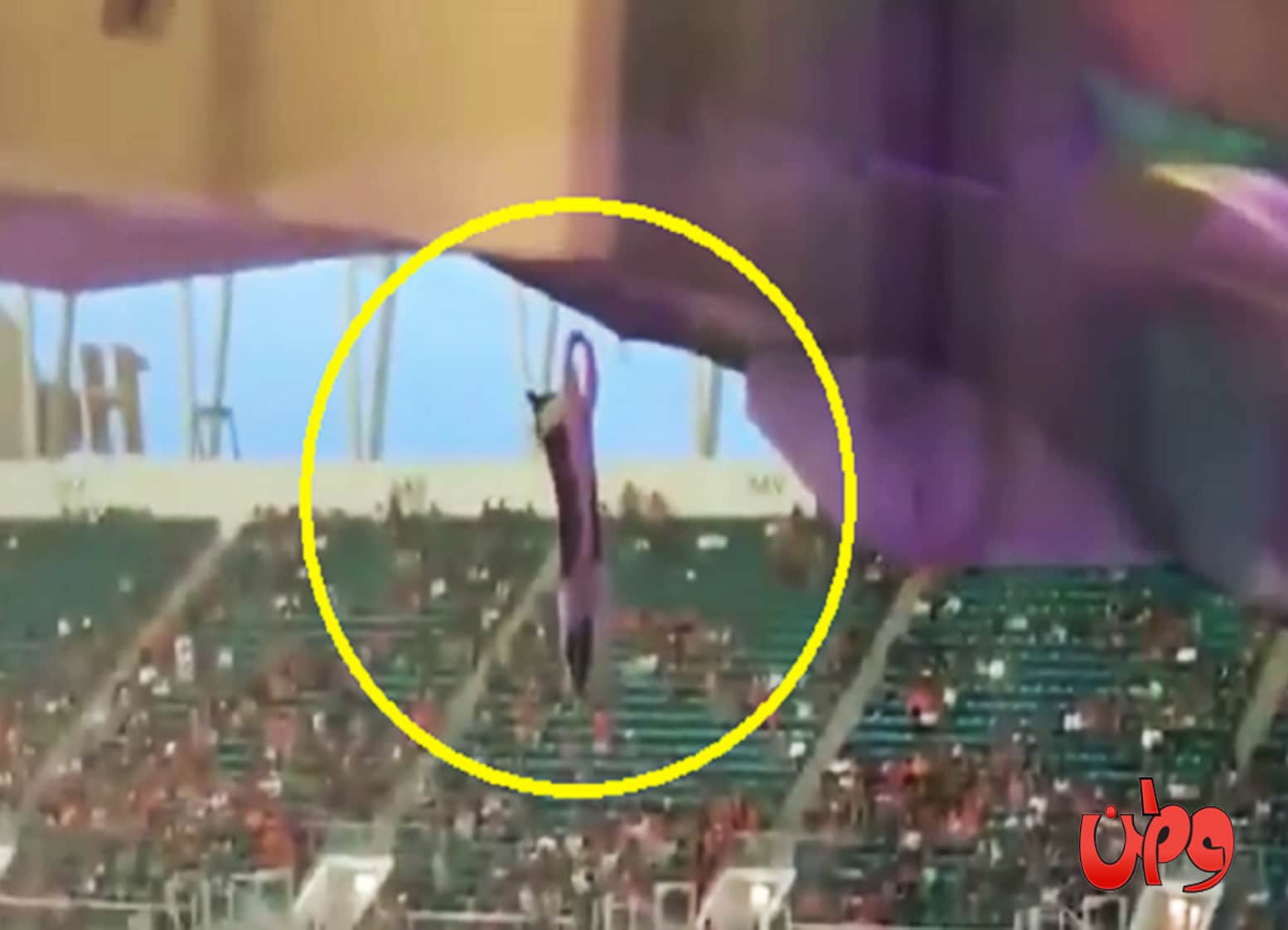 وتداول النشطاء عبر مواقع التواصل الاجتماعي مقطع فيديو للقط في يتدلى بشكل خطير من أعلى سقف المدرج داخل الملعب.
