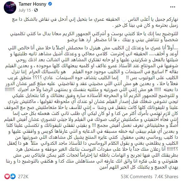 واضاف:”وللتوضيح للجمهور الكريم أنا والمخرجة الأستاذة سارة وفيق بعتنالك وكنا بنتحايل عليكي تيجي تشوفي شغلك قبل إصدار الفيلم عشان لو عندك أي ملحوظة تقوليها، ماكنتيش بتردي علينا وتليفوناتك كلها كانت بتقفل في وشنا”.