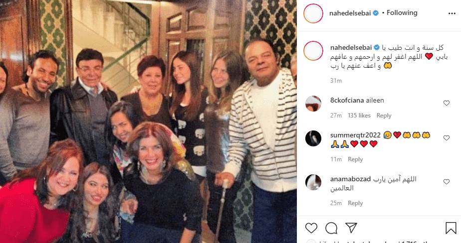ونشرت ناهد السباعي صورة تجمع والدها المخرج الراحل مدحت السباعي بعدد من النجوم ومنهم الراحلتين رجاء الجداوي و دلال عبد العزيز، إضافة إلى عدد من الفنانين منهم ميرفت أمين وسمير صبري و إيمي سمير غانم.