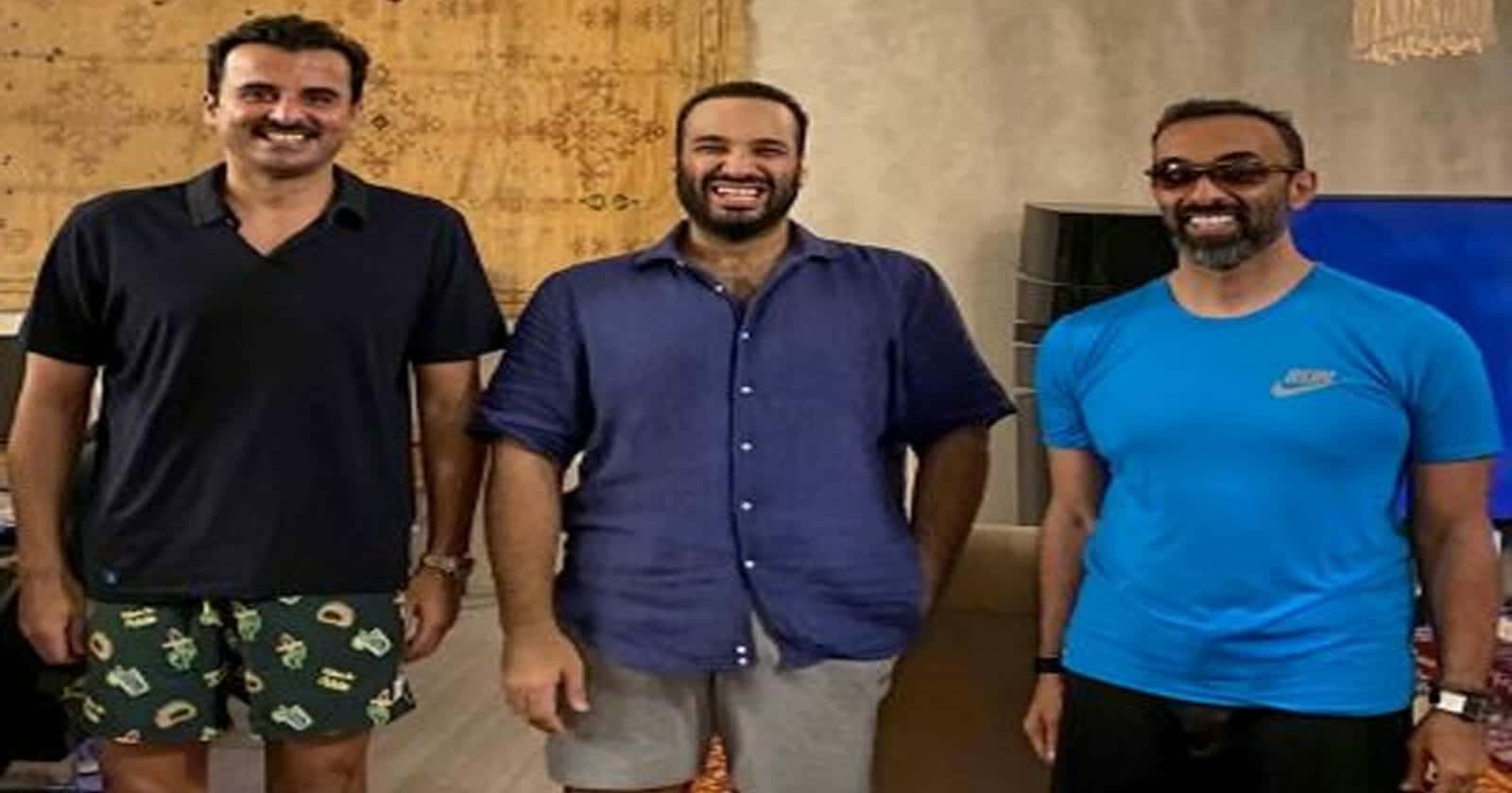 وتابع:”ويبدو أن الصورة التُقطت في وقت سابق من ذلك اليوم، وتُظهر الأمير محمد بن سلمان يقف بين أمير قطر تميم بن حمد آل ثاني ومستشار الأمن الوطني لدولة الإمارات الشيخ طحنون بن زايد آل نهيان، نجل مؤسس الدولة، والأخ الشقيق لزعيمها الفعلي، ولي العهد محمد بن زايد. وكان الثلاثة يرتدون ملابس الشاطئ وتعلو وجوههم ابتسامةٌ عريضة.”