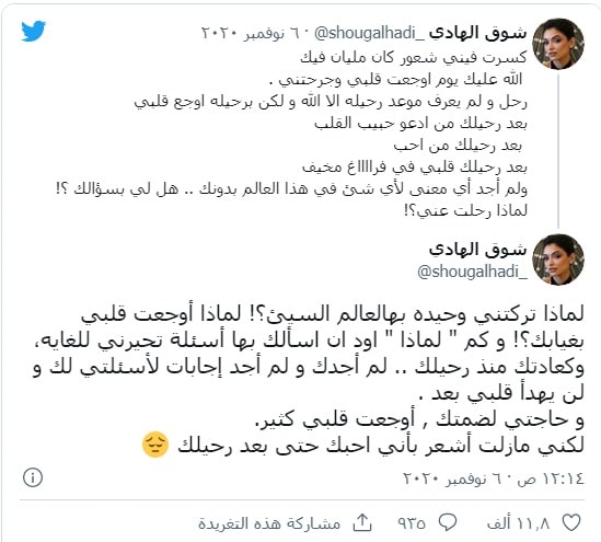 وقالت الهادي، في سلسلة تغريدات: “لماذا تركتني وحيده بهالعالم السيئ؟! لماذا أوجعت قلبي بغيابك؟! و كم ” لماذا ” اود ان اسألك بها أسئلة تحيرني للغايه، وكعادتك منذ رحيلك .. لم أجدك و لم أجد إجابات لأسئلتي لك و لن يهدأ قلبي بعد، وحاجتي لضمتك، أوجعت قلبي كثير، لكني ما زلت أشعر بأني احبك حتى بعد رحيلك”.