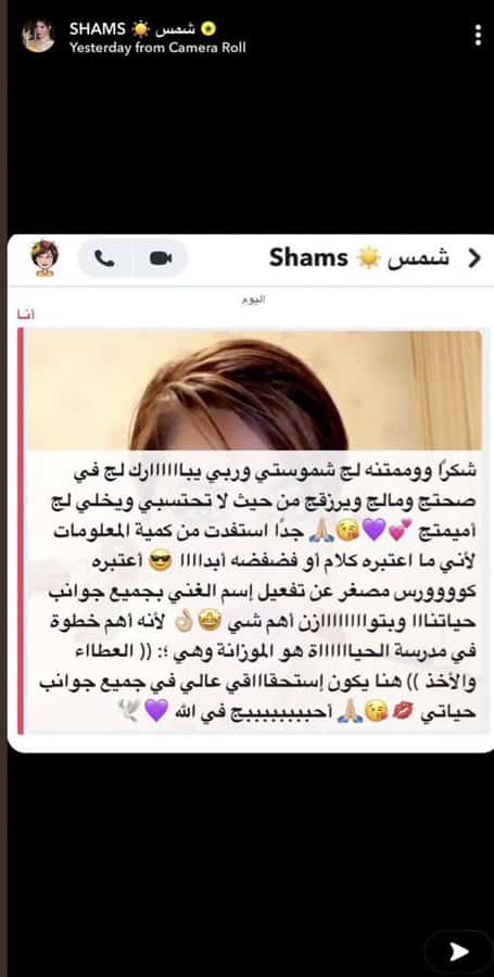 وجاء في رسالة أخرى: (أحستني، قمة المنطق والمصداقية منك فعلا، الغنى غنى النفس ويارب نوصل لها ونبتغي ما عند الله أكرم وأغنى وأوفى، الله يسعدك يا قلبي ويجزاكي خير، ويعطيك حتى يرضيك).