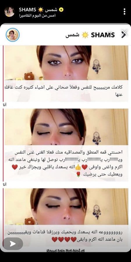 وأشارت شمس الكويتية إلى أن هؤلاء المشاهير مضطرين أن يصوروا لجمهورهم هذه الصورة، ليرتاحوا فقط، مضيفة: (وأنا لا أدعي أنني أفضل من الناس، أنا أسوأ وحدة خلقها رب العالمين وأزفت وحدة، لكن أزفت وحدة تنصحكم، دائماً النصيحة لو جاءتك من شخص لم يجرب أن يكون حراً ولم يجرب كل شيء، لا يمكنك أن تأخذ نصيحته كاملة، ولكن الشخص الذي رأى بعينه غير).