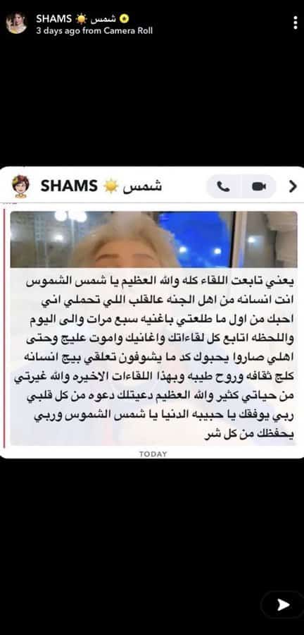 وبفيديو عبر (سناب شات)، قالت شمس الكويتية: (الذين يظهرون لكم أنهم في قمة السعادة، لا تعلمون الثمن الذي دفعوه، وأتحدى واحد أو وحدة من البلوجرز الذين يتظاهرون بأنهم أغنياء، ويضعون عينهم في عيني، ويخبرونني أن نقودهم فقط من الإعلانات).