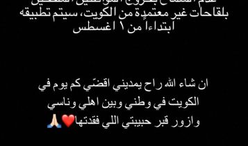 وختمت الفاشينستا الكويتية في منشور آخر: (وصلتني قبل دقائق معلومات تفيد بأن قانون عدم السماح خروج المواطنين الملقحين بلقاحات غير معتمدة من الكويت، سيتم تطبيقه ابتداء من 1 آب (اغسطس). إن شالله راح اقضي كم يوم في وطني وبين أهلي وأزور قبر حبيبتي اللي فقدتها).