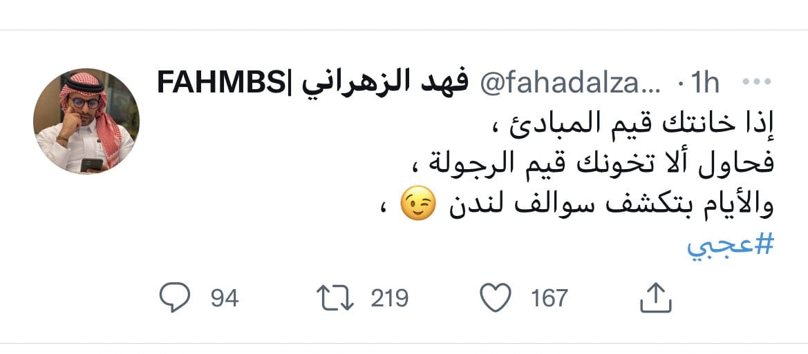 وقال فيها: (إذا خانتك قيم المبادئ، فحاول ألا تخونك قيم الرجولة، والأيام بتكشف سوالف لندن).