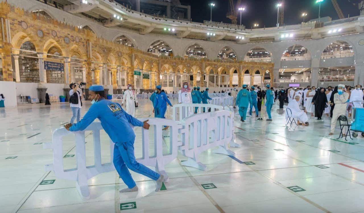 وعبر صفحتها الرسمية بتويتر قالت رئاسة شؤون الحرمين، إنه مواكبة لقرار تخفيف الإجراءات الاحترازية؛ فإن الرئاسة تباشر إزالة ملصقات التباعد الجسدي من جميع المواقع بالمسجد الحرام، استعداداً لصلاة فجر يوم غد الأحد.