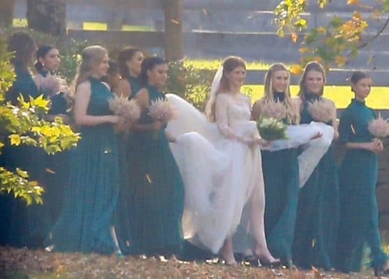 وخرجت العروس، التي كانت ترتدي ثوبًا مخصصًا من تصميم فيرا وانغ، من قصرها محاطة بتسع وصيفات يرتدين فساتين خضراء اللون، ويبدو أن جميعهن يبتسمن ويضحكن أثناء وقوفهن لالتقاط الصور.
