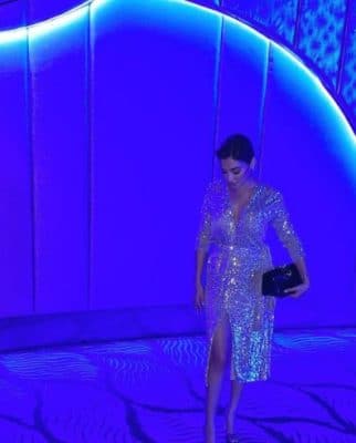 وكانت الفنانة الكويتية ترتدي فستاناً أسود من الساتان يكشف جزءاً كبيراً من صدرها.