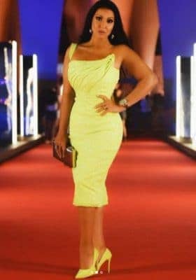 وارتدت سمية فستانا فضياً بحبيبات براقة، وقماشاً شفافاً كشف ساقيها ويديها بوضوح، يُشبه فستان اللبنانية نادين نجيم.