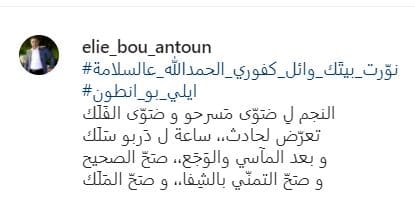 وتابع: (النجم لِ ضَوّى مَسرحو و ضَوّى الفَلَك تعرّض لحادث،، ساعة ل دَربو سَلَك و بعد المآسي والوَجَع،، صَحّ الصحيح و صَحّ التمنّي بالشِفا،، و صَحّ المَلَك).