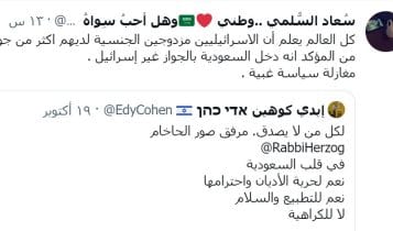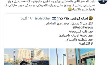 وكان حساب “إسرائيل بالعربية” نشر في فبراير الماضي، شريط فيديو للحاخام يعقوب يسرائيل هرتسوغ. وهو يدعو لشفاء ولي العهد السعودي، الأمير محمد بن سلمان، الذي خضع لعملية جراحية.