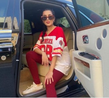 ونسقتها حينها مع تيشرت رياضي واسع، وتجلس في سيارة فارهة.
