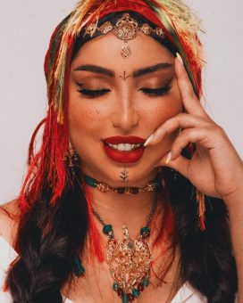 ووضعت خصلات شعر ملونة بألوان قوس قزح على رأسها، وقسمت شعرها إلى جدائل زينتهم باكسسوارات غريبة.