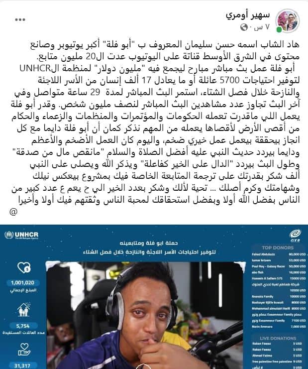 وقال: “بمناسبة وصولي ال20 مليون قررت نسوي حملة متابعين أبو فلة لتوفير احتياجات آلاف الأسر اللاجئة خلال فصل الشتاء”.