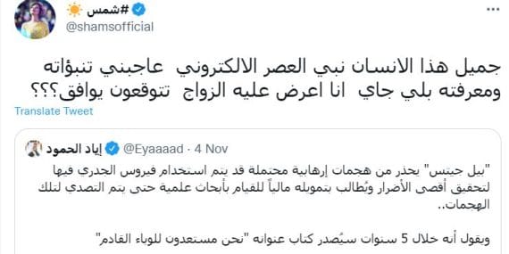 كما عقبت شمس على الخبر: “جميل هذا الإنسان نبي العصر الإلكتروني عاجبني تنبؤاته ومعرفته بلي جاي أنا أعرض عليه الزواج… تتوقعون يوافق؟”.