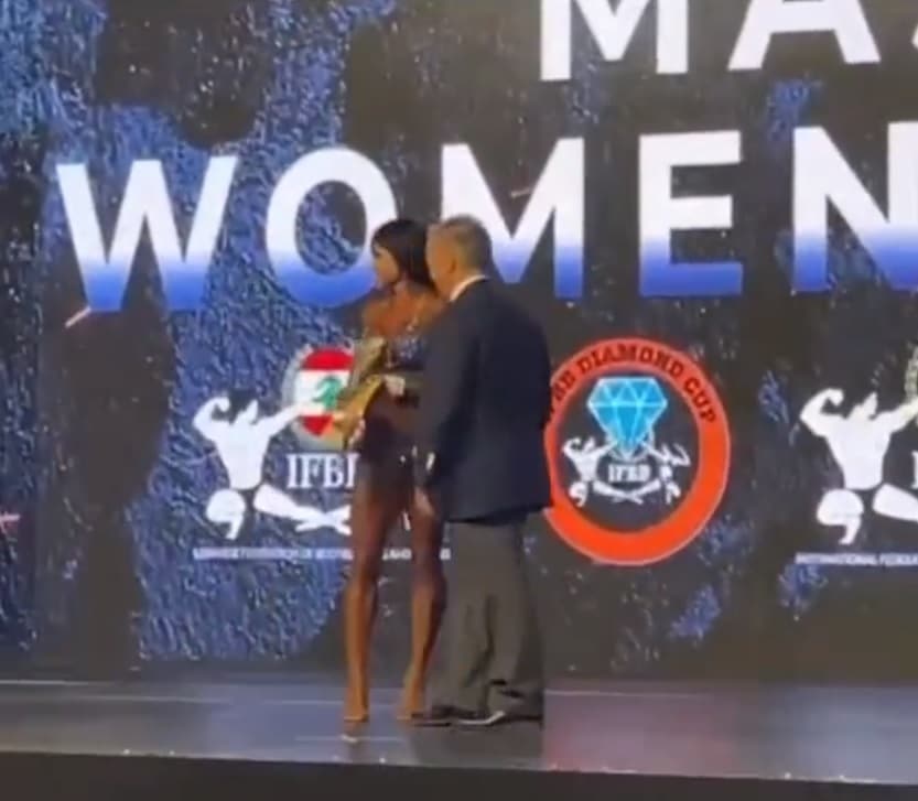 ويُظهر المقطع تكريمها خلال بطولة مخصصة لكمال أجسام السيدات.