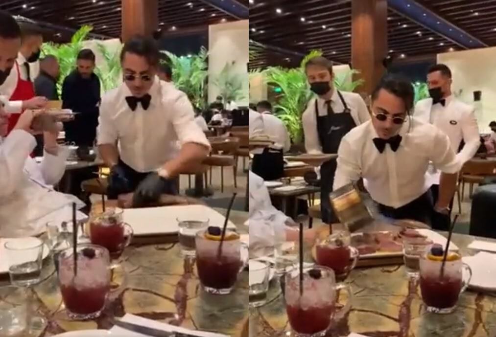 المقطع الذي نشره الصحفي السعودي إبراهيم الحذيفي، أظهر لحظة قيام الشيف نصرت بتقديم الطعام على طريقته الخاصة، للأمير عبدالرحمن بن مساعد وضيوف آخرين معه.
