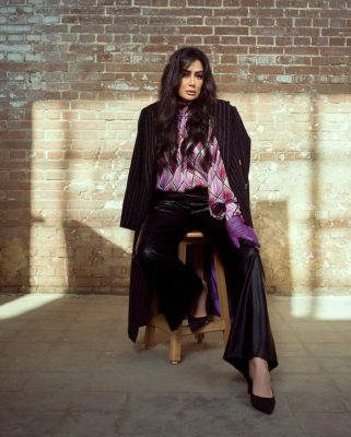حيث ارتدت الفنانة قميصاً مورداً باللون البنفسجي، وبنطال أسود واسع، وفوقه جاكيت أسود مخطط.