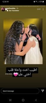 وتظهر الفنانة بلقطة أخرى وكأنها تقبل شقيقتها من شفتيها، معقبة: “اطيب اخت واحلا قلب اختي عليا”.