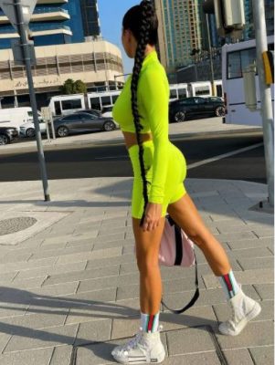 وقبل ذلك بأيام، استعرضت لاميتا جسدها بملابس رياضية ضيقة في وسط أحد شوارع دبي.