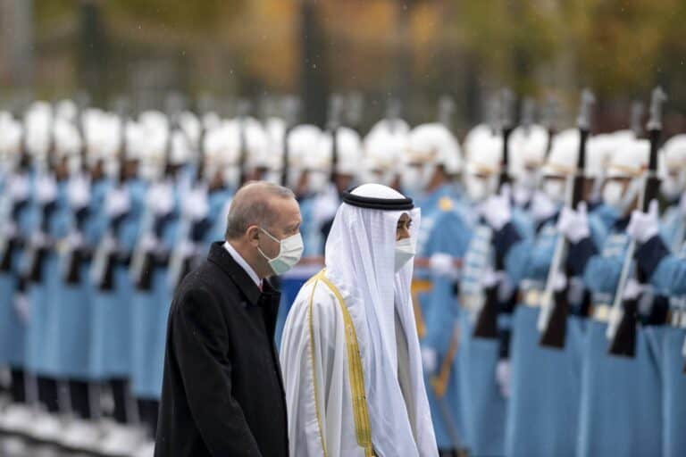 واستقبل الرئيس التركي رجب طيب أردوغان اليوم، الأربعاء، في المجمع الرئاسي بأنقرة، ولي عهد أبوظبي الشيخ محمد بن زايد، حاكم الإمارات الفعلي، بعد قطيعة استمرت لسنوات بين الإمارات وتركيا.