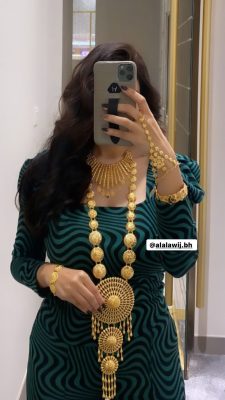 ونشرت المهرة مجموعة من الصور والفيديوهات، التي ظهرت خلالها أطقماً ثقيلة من الذهب البحريني عيار 21.