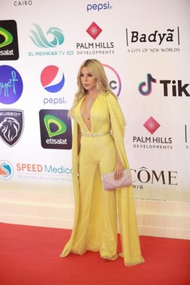 حيث ارتدت رزان جمبسوت أصفر لامع، ضيق يكشف تفاصيل جسدها بدقة.