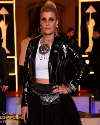 حيث ارتدت فيدرا تنورة طويلة مع جاكيت أسود من الجلد، أسفله تيشرت كُتب عليه “أمم أمثالكم”.