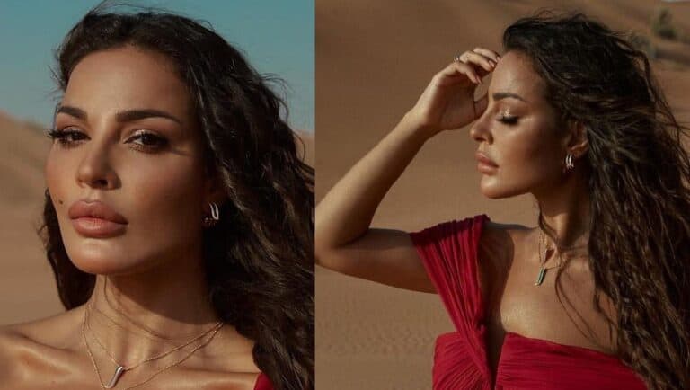 كما وظهرت نجيم بالصور التي نشرتها عبر “انستجرام” بفستانين مختلفين في صحراء دبي.