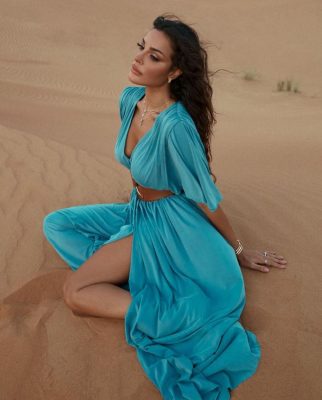 فظهرت الفنانة في إحدى الصور بفستان أزرق بفتحة صدر جريئة، وفتحة جانبية تكشف ساقها في وضعية الجلوس.