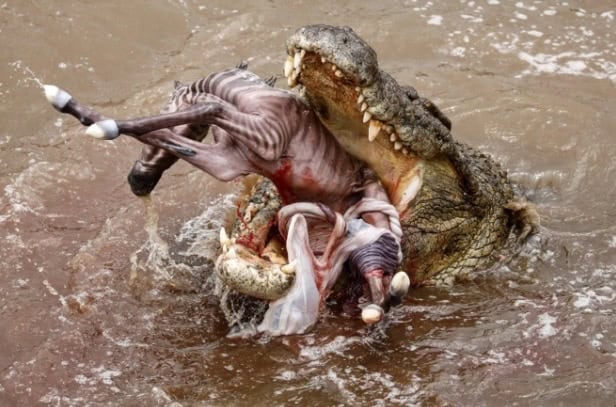 في الصورة، يظهر الحمار الوحشي وهو ملطخ بالدماء بين فكيّ التمساح في الماء قبل لحظات من ابتلاعه.