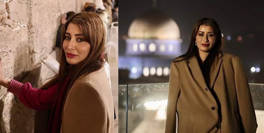 ونشرت ملكة جمال العراق سارة عيدان صورة لها عبر حسابها على “تويتر”، وهي تقف أمام حائط البراق – الجدار الغربي للسمجد الاقصى-.