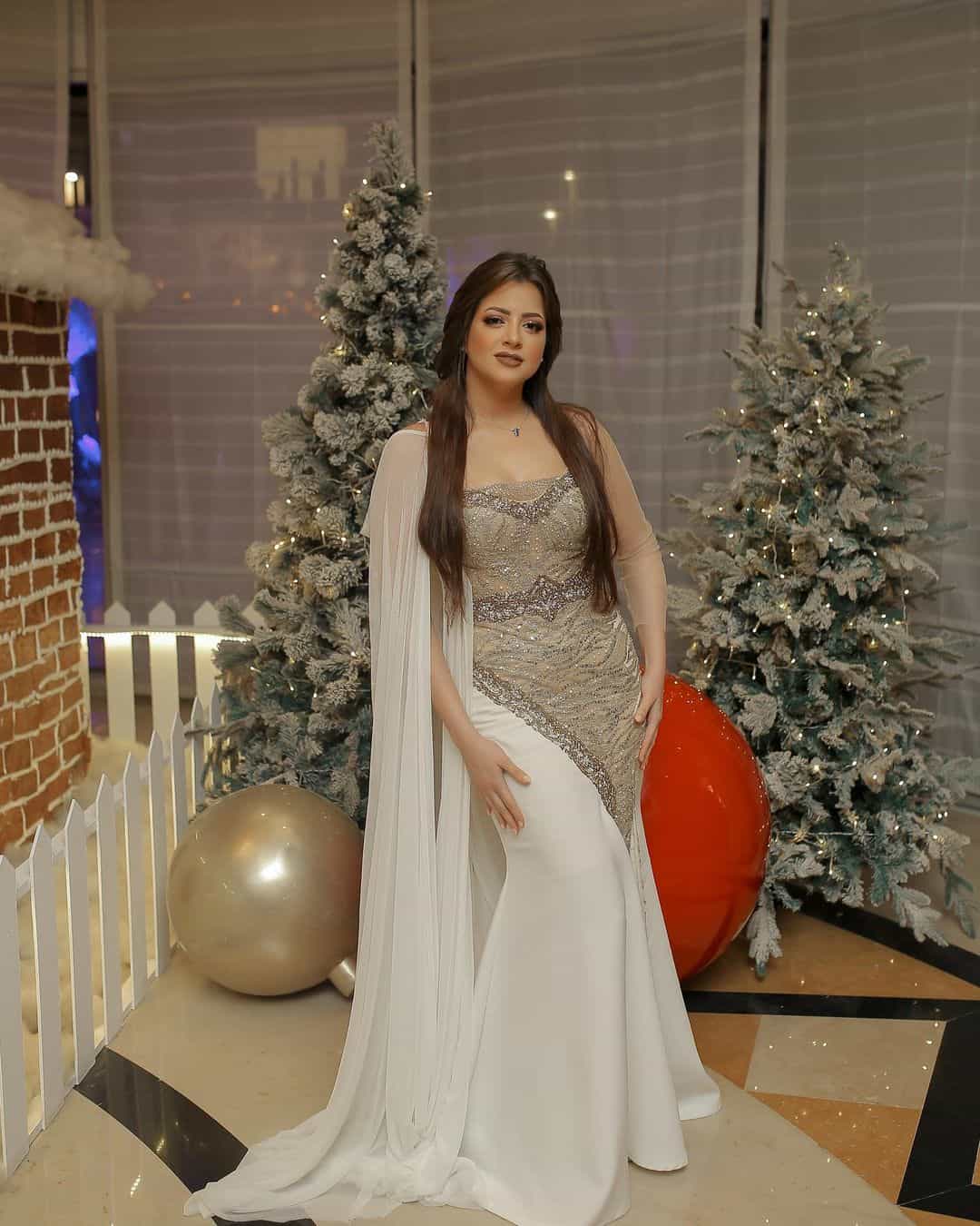 ونشرت منى فاروق الصورة عبر “انستجرام”، وهي ترتدي فستاناً باللون البيج والأبيض، مع تطريز فضي.