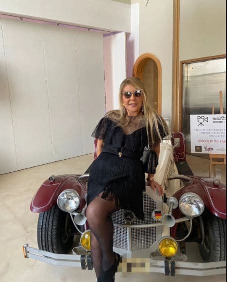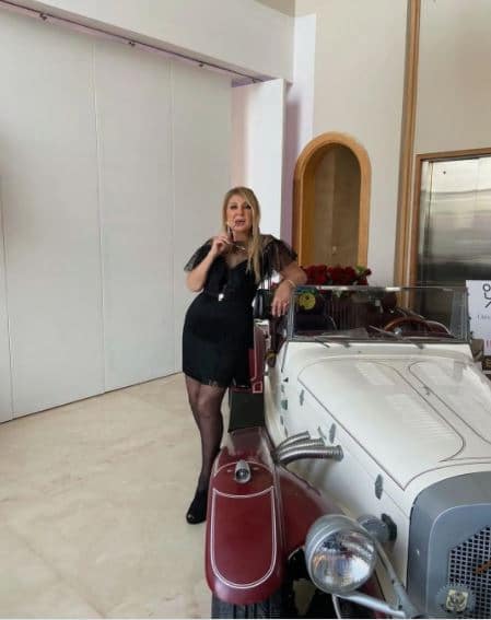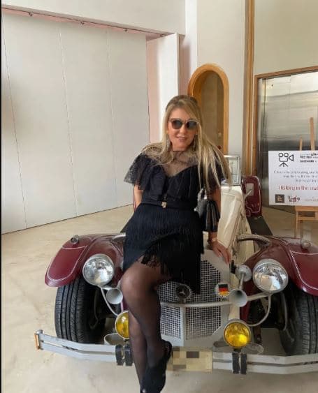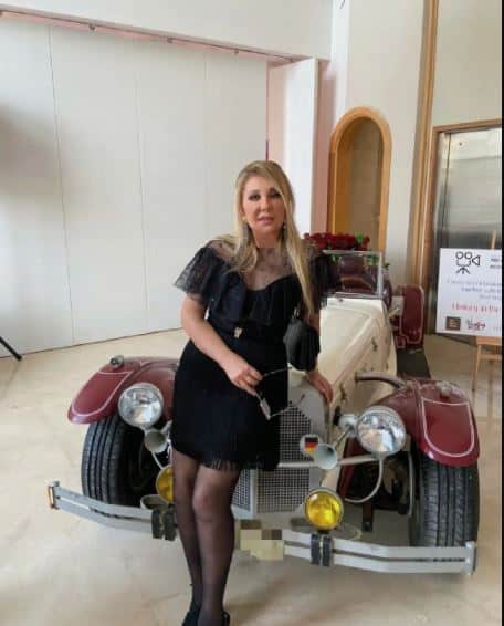 ونشرت نادية الجندي صورها التي ظهرت فيها بفستان أسود قصير، فوق الركبة، وجلست على مقدمة سيارة كلاسيكية في أحد المعارض.