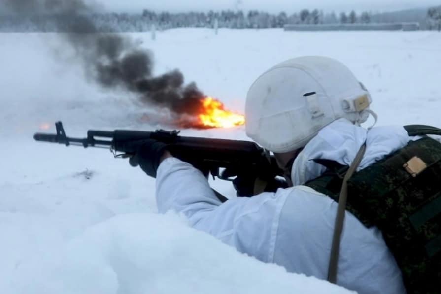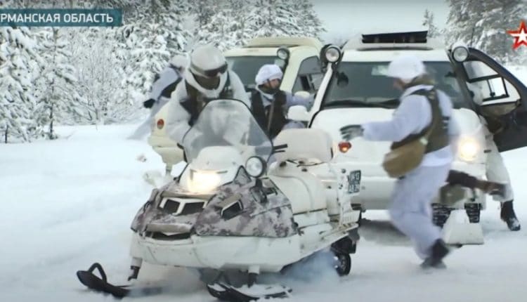 وشُوهدت فرق الاستطلاع على مركبات ثلجية وهي تتدرب على القتال ضد عدو وهمي في ظروف قاسية جدا حرارتها أقل من 10 درجات تحت الصفر. في الوقت الذي تواصل فيه روسيا حشد قواتها على الحدود مع جارتها أوكرانيا.