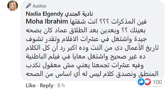 وتابعت: “بعد الطلاق عماد كان بصحه جيدة واشتغل في عشرات الافلام وتقدر تشوف تاريخ الأعمال دى من النت. وده اكبر رد أن كل الكلام ده غير صحيح واشتغل معايا في فيلم الباطنية. وفيه عشرات تجمعنا يعني مش معقول نكدب المنطق ونصدق كلام ليس له أي اساس من الصحه”.