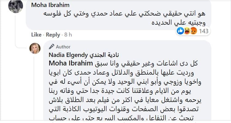 وهو ما استفز نادية الجندي وجعلها ترد فكتبت: “كل دي إشاعات وغير حقيقي، وأنا سبق ورديت عليها بالمنطق والدلائل. وعماد حمدي كان أبويا وأخويا وزوجي وأبو ابني الوحيد”.