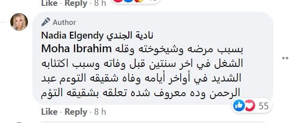 وكتبت في تعليق آخر: ” بسبب مرضه وشيخوخته وقلة الشغل في اخر سنتين قبل وفاته. وسبب اكتئابه الشديد في أواخر أيامه وفاه شقيقه التوءم عبد الرحمن وده معروف شده تعلقه بشقيقه التوأم”.
