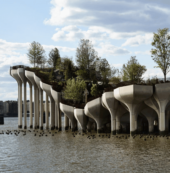 تم افتتاح جزيرة Little Island للمصمم البريطاني توماس هيذرويك أمام سكان نيويورك في مايو. وقد استخدم المصمم 132 عمودًا خرسانيًا تم وضعه في نهر هدسون لدعم الجزيرة.