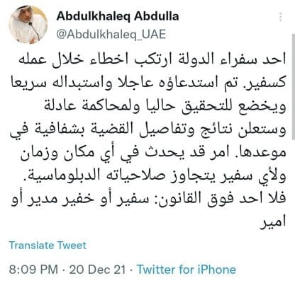وقال عبدالخالق عبدالله، كاشفا عن تطورات القضية دون أن يذكر اسم السفير:”أحد سفراء الدولة ارتكب أخطاء خلال عمله كسفير. تم استدعاؤه عاجلا واستبداله سريعا.”