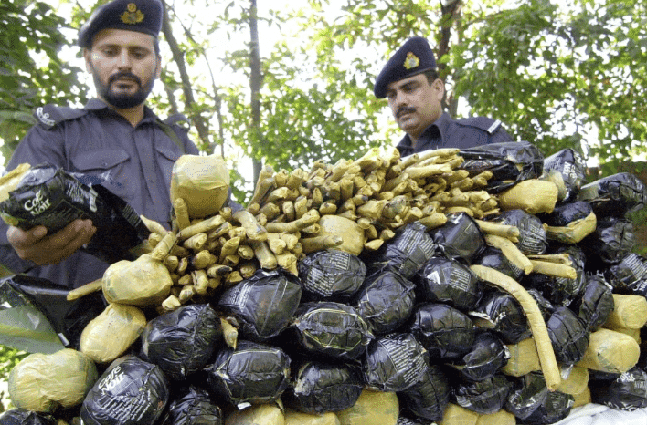 مسؤولو الجمارك يتفقدون كمية ضخمة من المخدرات تم ضبطها في بيشاور، باكستان متجهة إلى السعودية في 19 يونيو 2003. طارق محمود / وكالة AFP عبر GETTY IMAGES