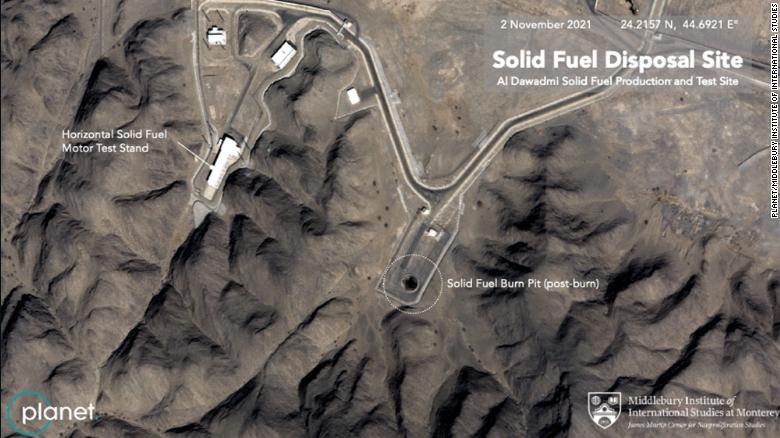 وأظهرت صور الأقمار الصناعية التي التقطتها شركة “بلانيت”، وهي شركة تصوير تجارية، بين 26 أكتوبر و9 نوفمبر الماضي، حدوث عملية حرق في منشأة بالقرب من الدوادمي غرب الرياض. وفقًا لباحثين في معهد ميدلبري للدراسات الدولية. الذين أخبروا شبكة CNN أن هذه الصور هي “أول دليل لا لبس فيه على أن المنشأة تعمل لإنتاج صواريخ”.