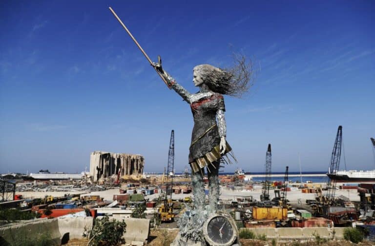 تمثال لامرأة للفنانة اللبنانية حياة ناظر ، مصنوع من بقايا زجاج وحطام وساعة مكسورة ، إيذانا بالوقت (6:08 مساءً) للانفجار الضخم في مرفأ بيروت الذي وقع في آب 2020 (AFP)