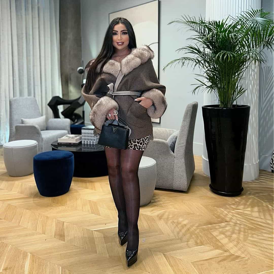 وظهرت دنيا بطمة في الصور التي نشرتها عبر “انستجرام”، وهي ترتدي تنورة قصيرة جداً “ميني جيب”بنقشة التايجر، نسقتها مع معطف من الفرو باللون الرمادي.