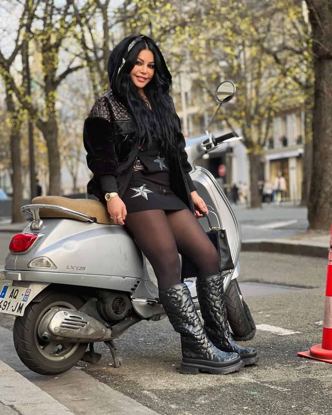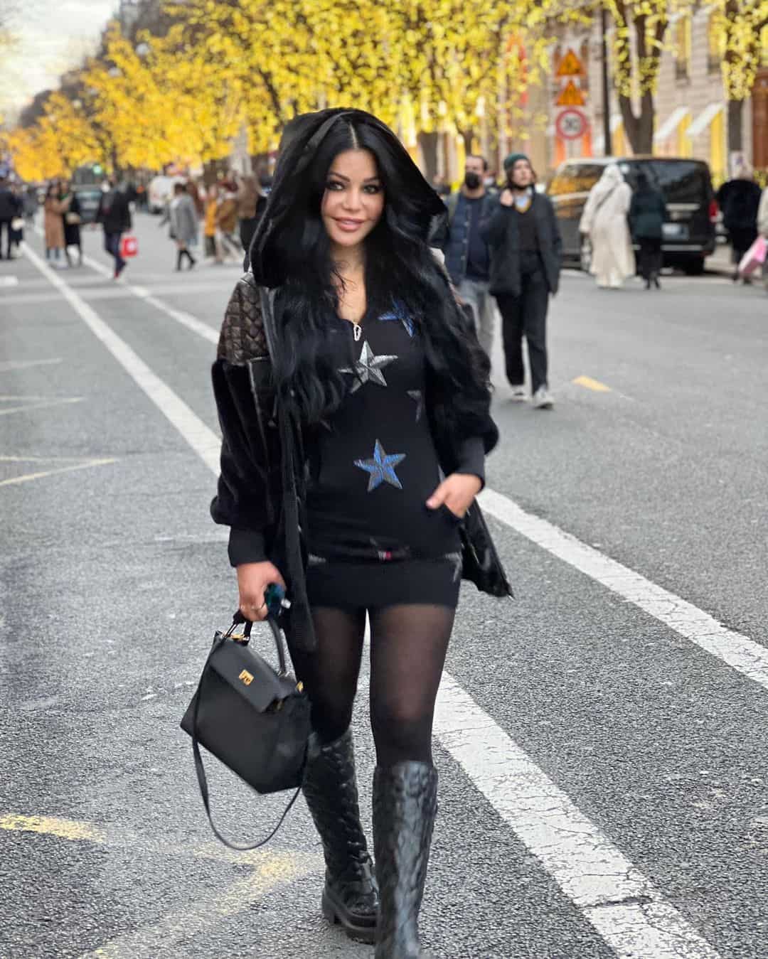 واستكملت الفنانة إطلالتها في شوارع باريس. حيث تقضي عطلة رأس السنة الميلادية الجديدة 2022، بجاكيت فرو منفوخ.