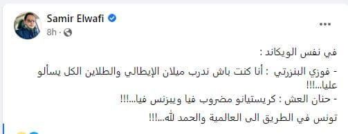 واستكمل الوافي سخريته: “اتصلت بصديقه هادي زعيم ليطالب بحق الرد لكن هادي تجنب الرد على إتصالاته المتكررة…فاتصل بصديقه الفنان منصف عبلة الذي يعرفه منذ حفل طهور إبنه جيلاني فتواصل عبلة مع هادي لنفس الغرض بطلب من كريستيانو “.