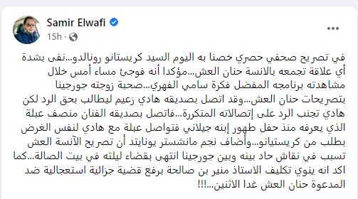 وتابع: “وأكد كريستيانو أنه فوجئ مساء أمس خلال مشاهدته برنامجه المفضل فكرة سامي الفهري…صحبة زوجته جورجينا بتصريحات حنان”.